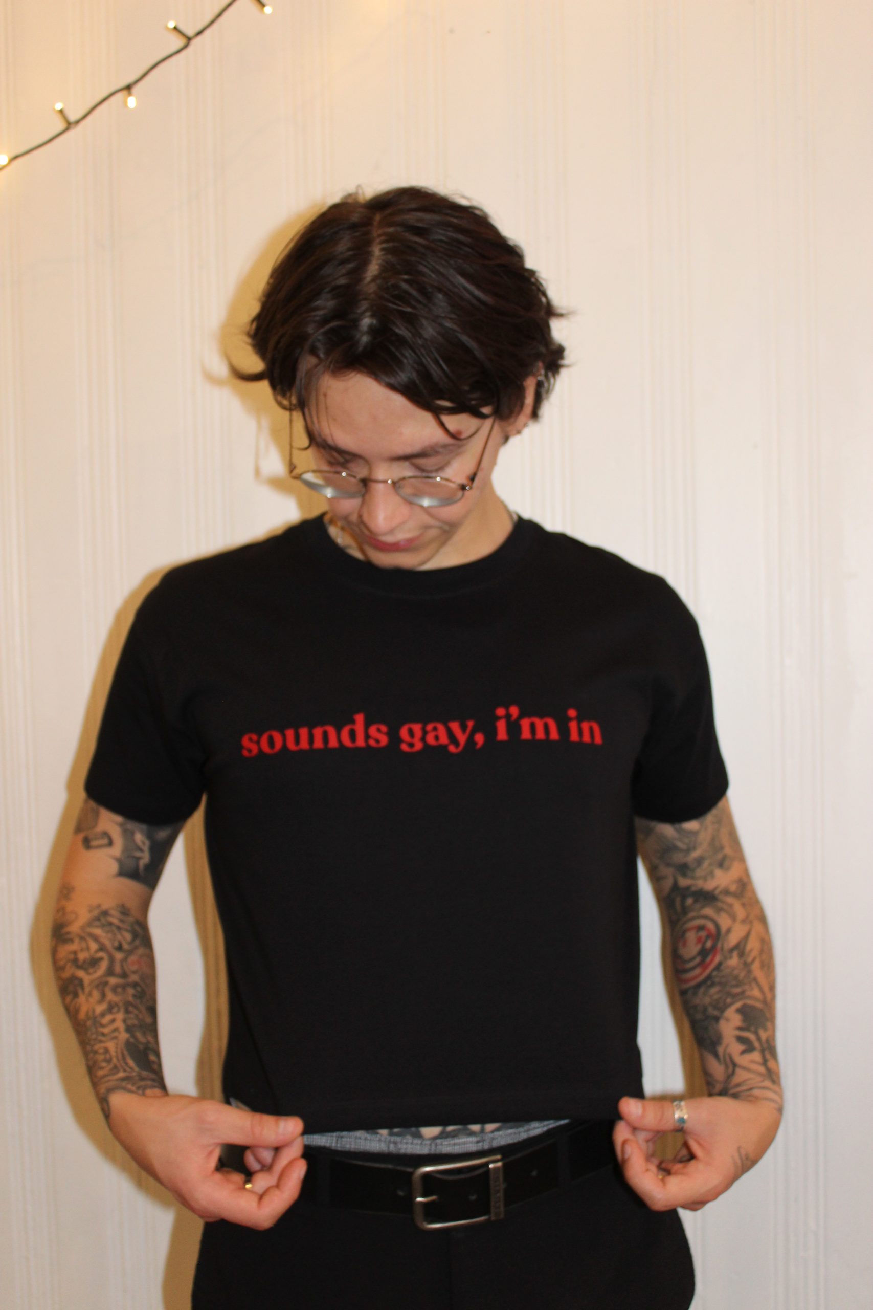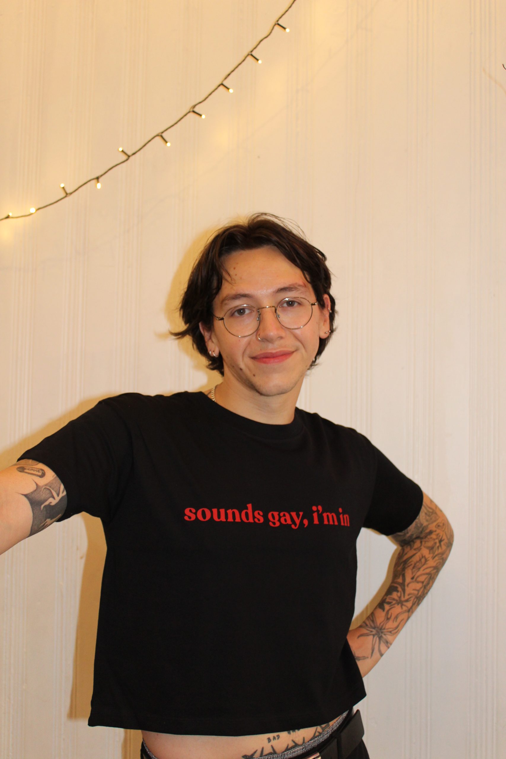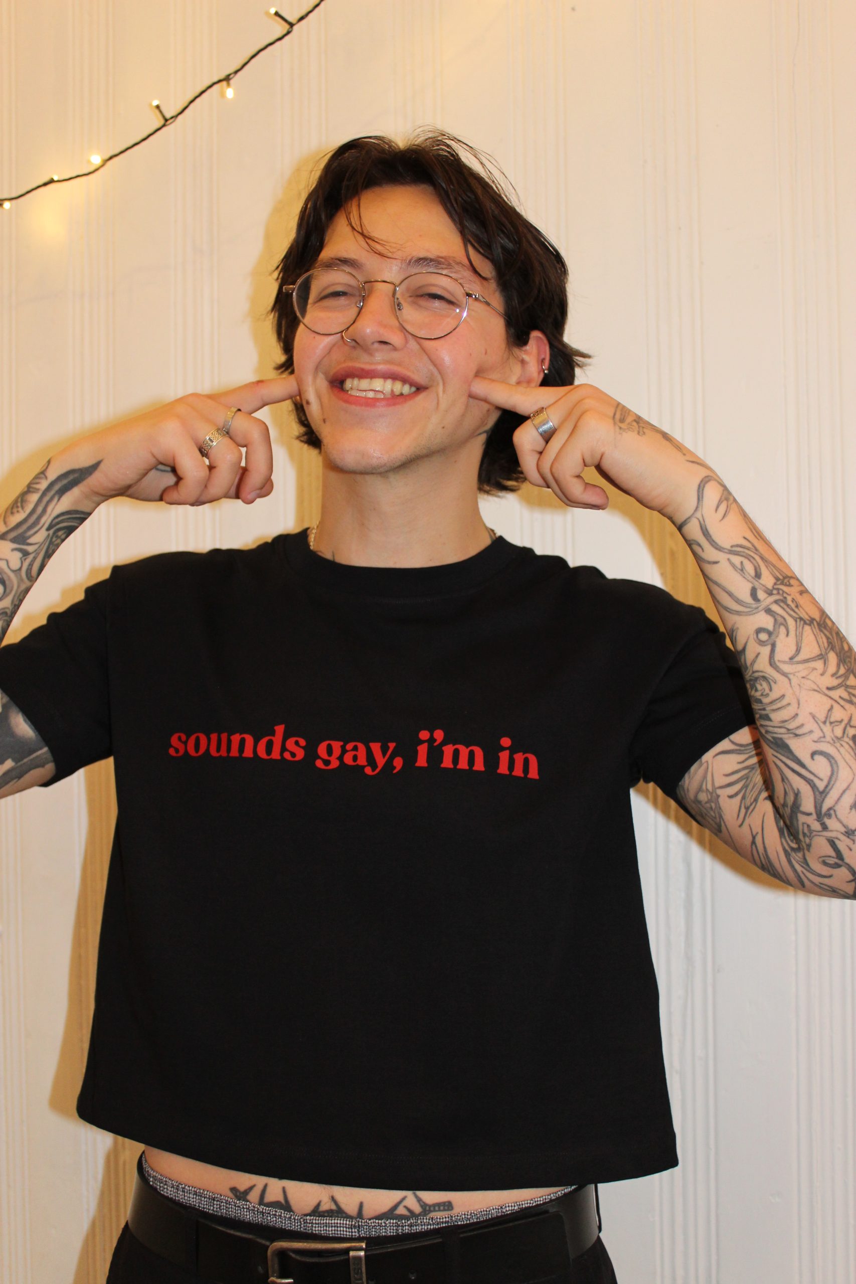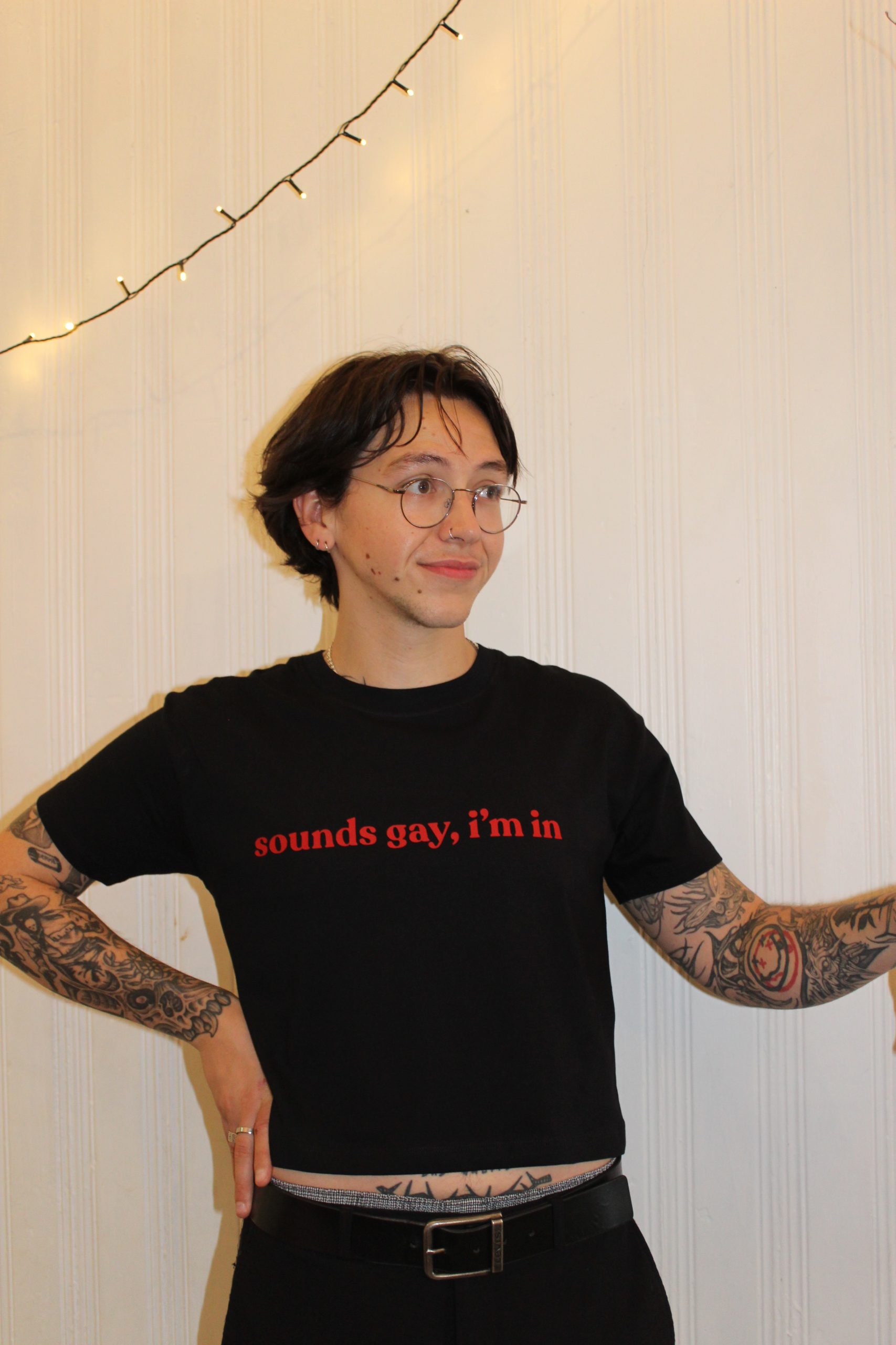 Sounds Gay red design on our Black Boxy Crop T-Shirt in size Small. This Jersey tee is made from 100% Certified Organic Cotton with a fabric weight of 145gsm. Fair Wear Accredited, PETA-Approved Vegan. Model Sam is 5’9 and wears a size Small. This design is available in more sizes, colours and styles. Please get in touch if you’d like to customise your own!